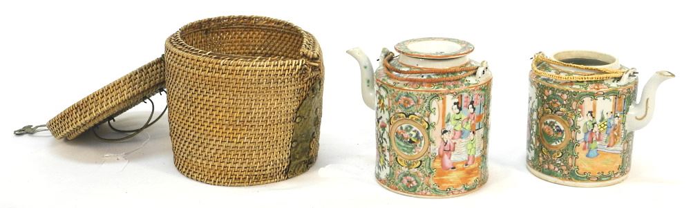 2 Chinese Canton Enamel Teapots: 1 with Wicker Surround & 1 Missing Lid, 7 1/2" high.