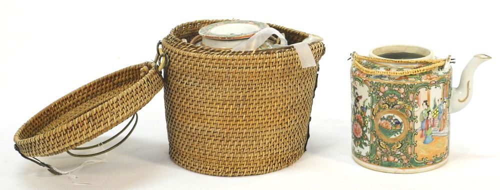 LOT 188 2 Chinese Canton Enamel Teapots: 1 with Wicker Surround & 1 Missing Lid, 7 1/2" high. Estimate: $80 - $120 Sold For: $45 Auction Date: Tuesday, October 18 2022 at 6:00 PM
