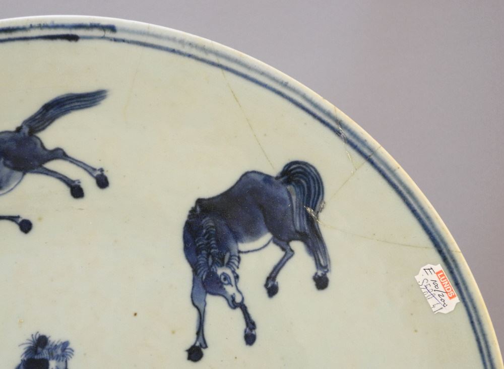 Chinese Blue & White "8 Horses of Mu Wang" Dish, Cracked & Restored, 14 1/2" Diameter.