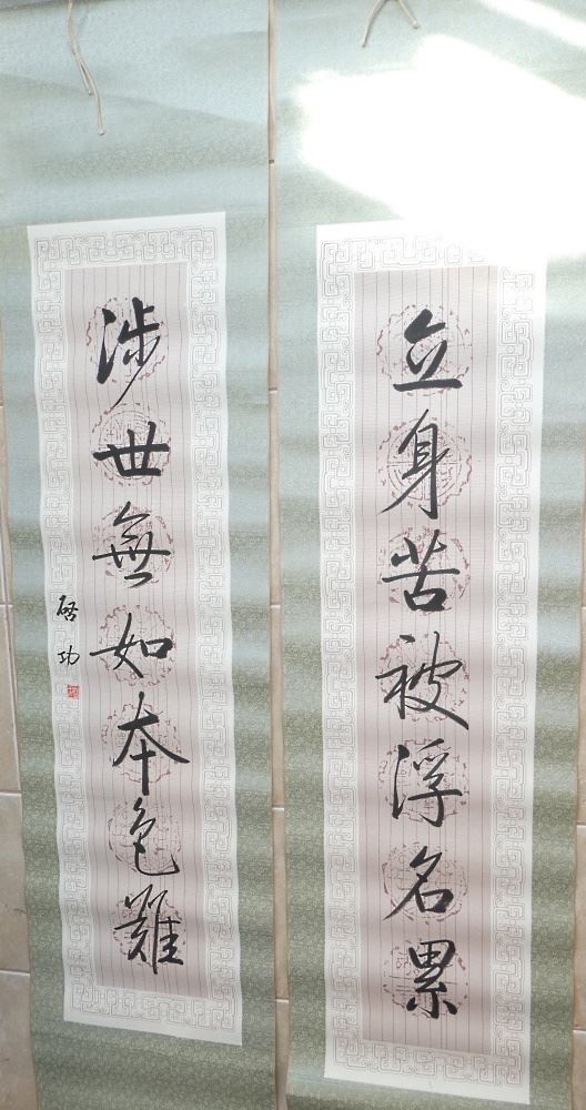 Pair of Ink on Paper Calligraphy Couplets "Journey of Life", Signed Ch'i Kung, 78" x 18", 20th