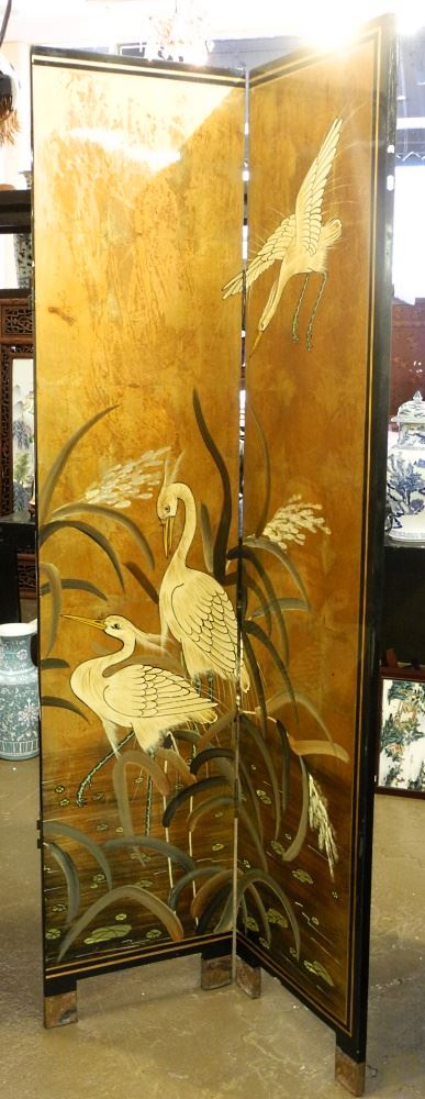 LOT 119 4 Panel Lacquer "Cranes" Screen, 72" high. Estimate: $150 - $300 Sold For: $400 Auction Date: Tuesday, October 18 2022 at 6:00 PM