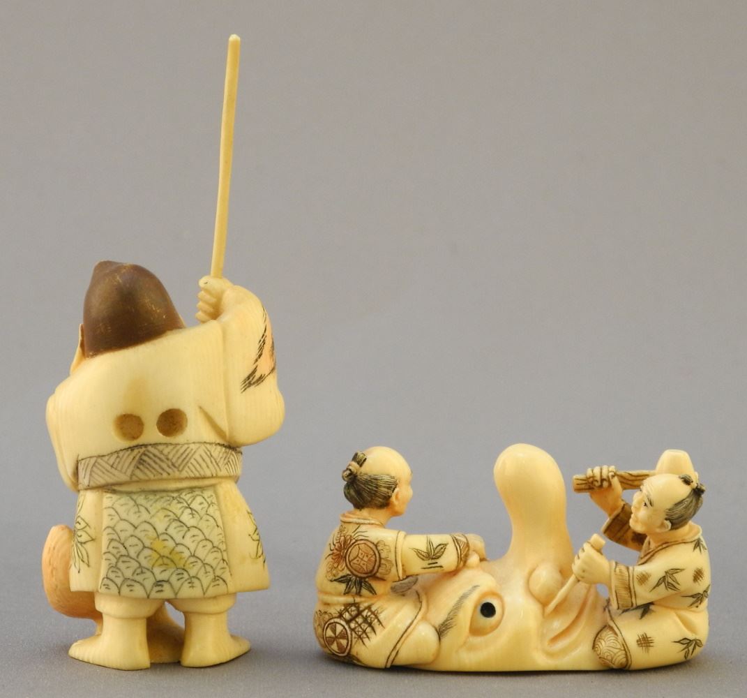LOT 373 2 Japanese Figural Netsukes: Ebisu & Mask Makers, 3 1/4"H & 2"L, No Export. Estimate: $100 - $200 Sold For: $140 Auction Date: Tuesday, October 18 2022 at 6:00 PM
