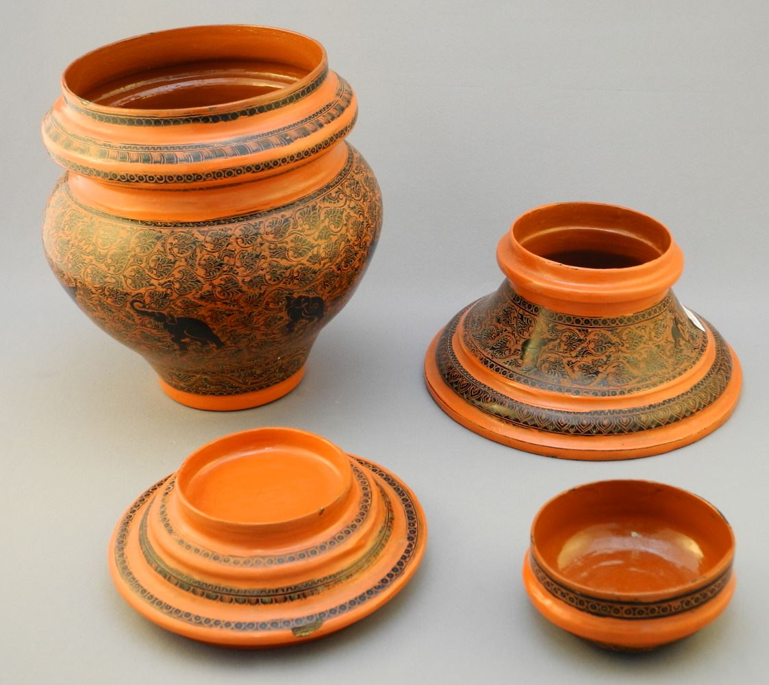 Burmese Red Lacquer Offering Bowl, 4 Sections, As Found, 12 3/8" High.