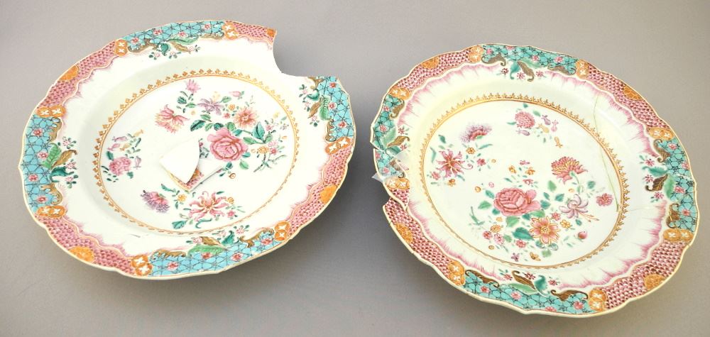 6 Chinese Export Porcelain Plates & Soup Plates, Damaged/ Fragmentary, 9" diameter.