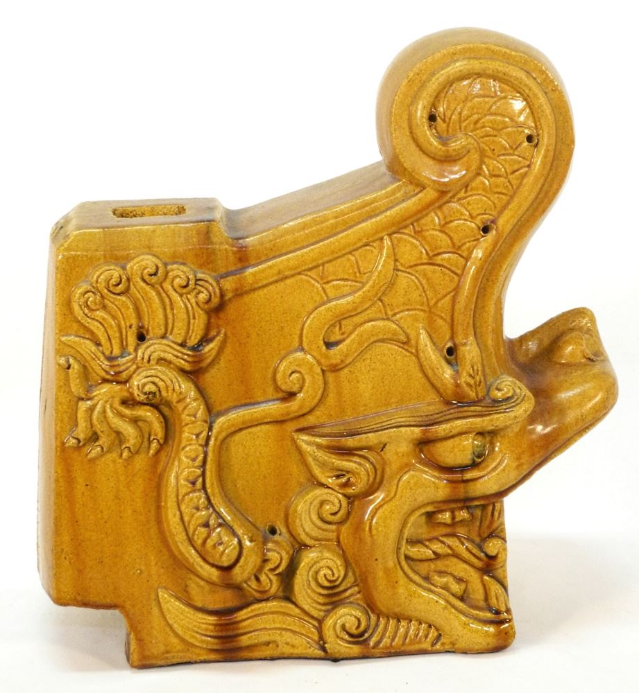 LOT 2 Yellow Glaze Chinese "Dragon" Roof Tile, 14 1/2" length. Estimate: $100 - $200 Sold For: $50 Auction Date: Tuesday, October 18 2022 at 6:00 PM