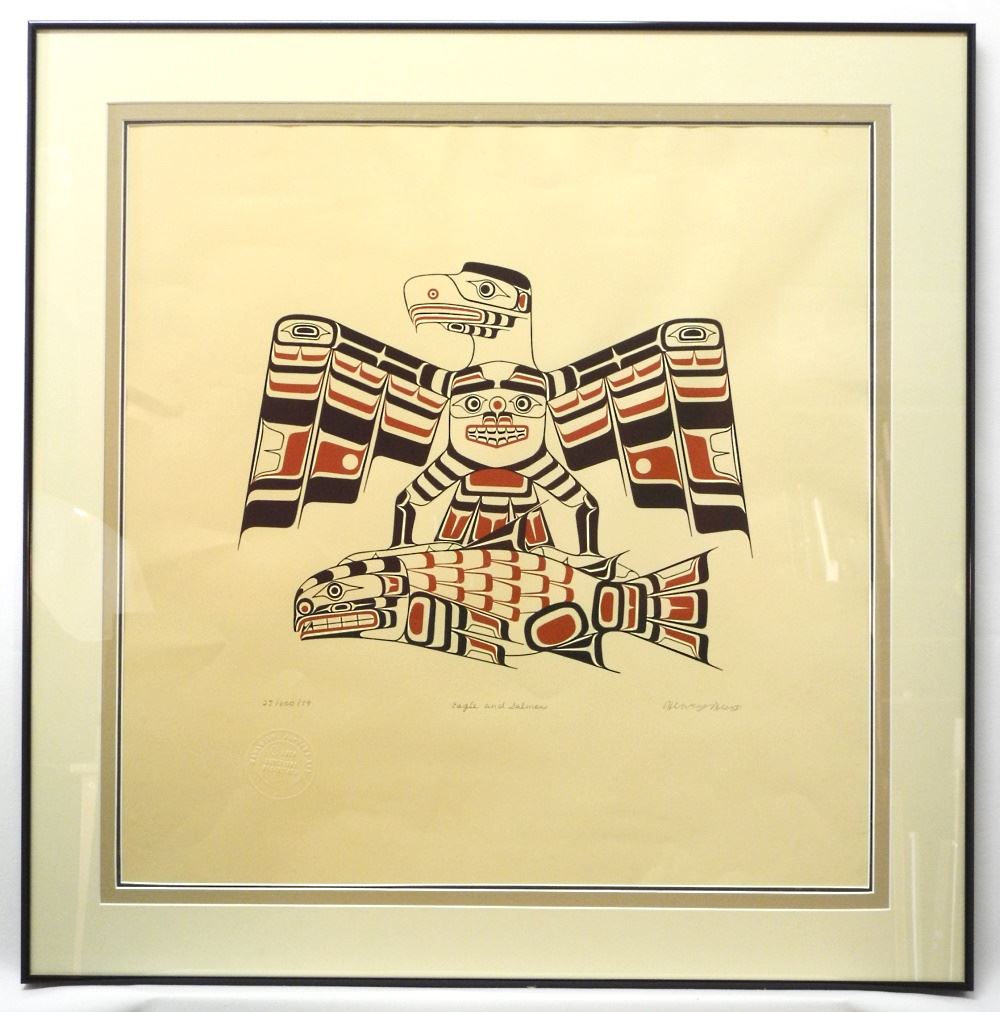 LOT 319 Kwagiulth Serigraph Signed Henry Hunt, 22 7/8" x 33 3/8", "Eagle & Salmon", 28/600/79. Estimate: $100 - $200 Sold For: $350 Auction Date: Tuesday, October 18 2022 at 6:00 PM