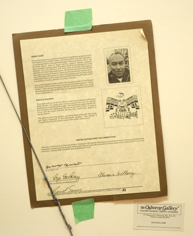 Kwagiulth Serigraph Signed Henry Hunt, 22 7/8" x 33 3/8", "Eagle & Salmon", 28/600/79.