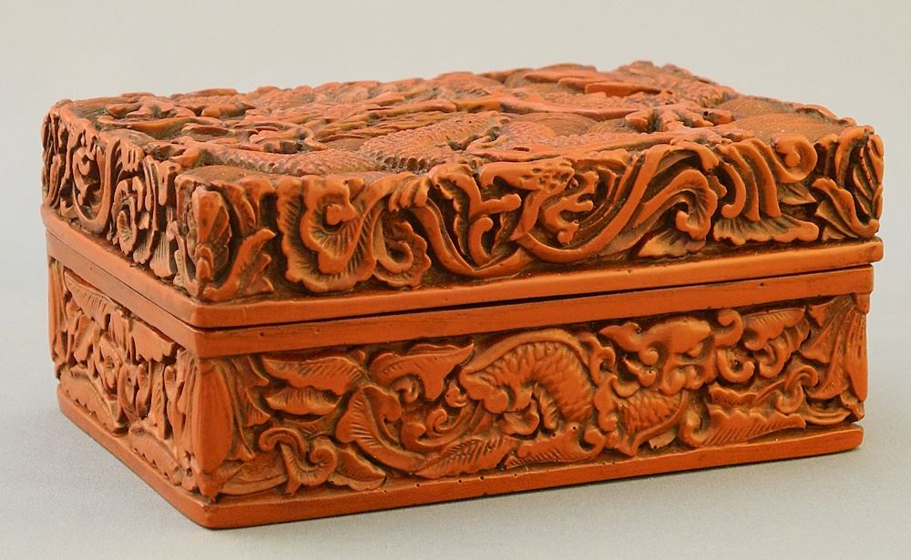 LOT 108 Cinnabar Lacquer Box "Dragons" Qianlong Mark, 4 1/8"W Estimate: $60 - $100 Sold For: $70 Auction Date: Tuesday, July 25 2023 at 4:00 PM