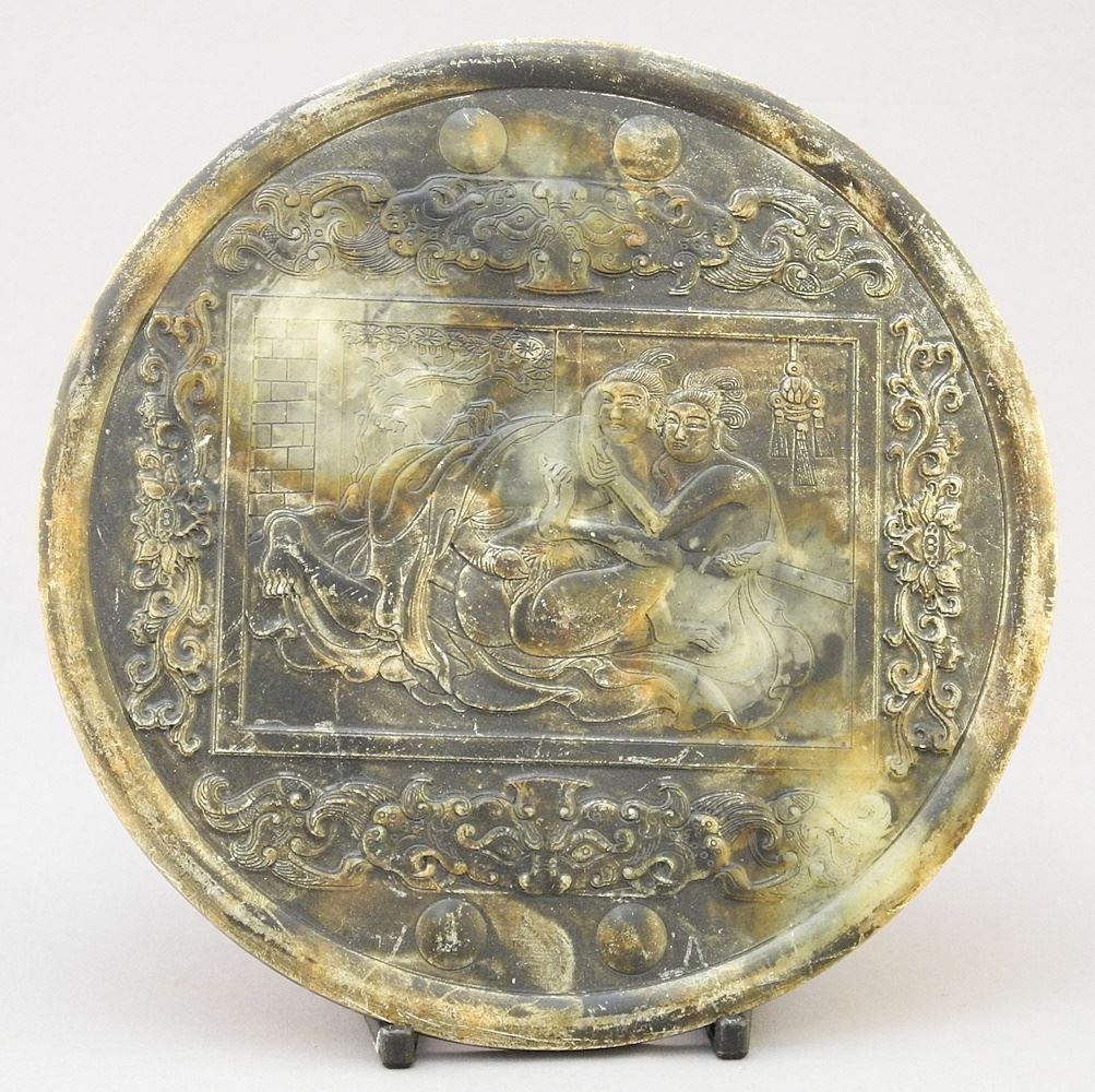Chinese Erotic Softstone Plaque, 6 5/8" diam.