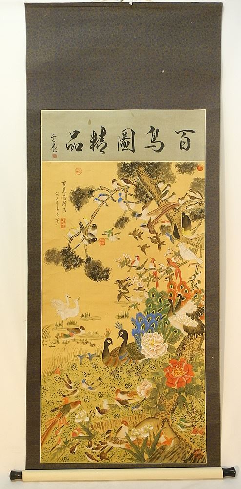 Chinese Ink and Colour, "Birds in Garden", Scroll Sight, 44 1/2" x 24"