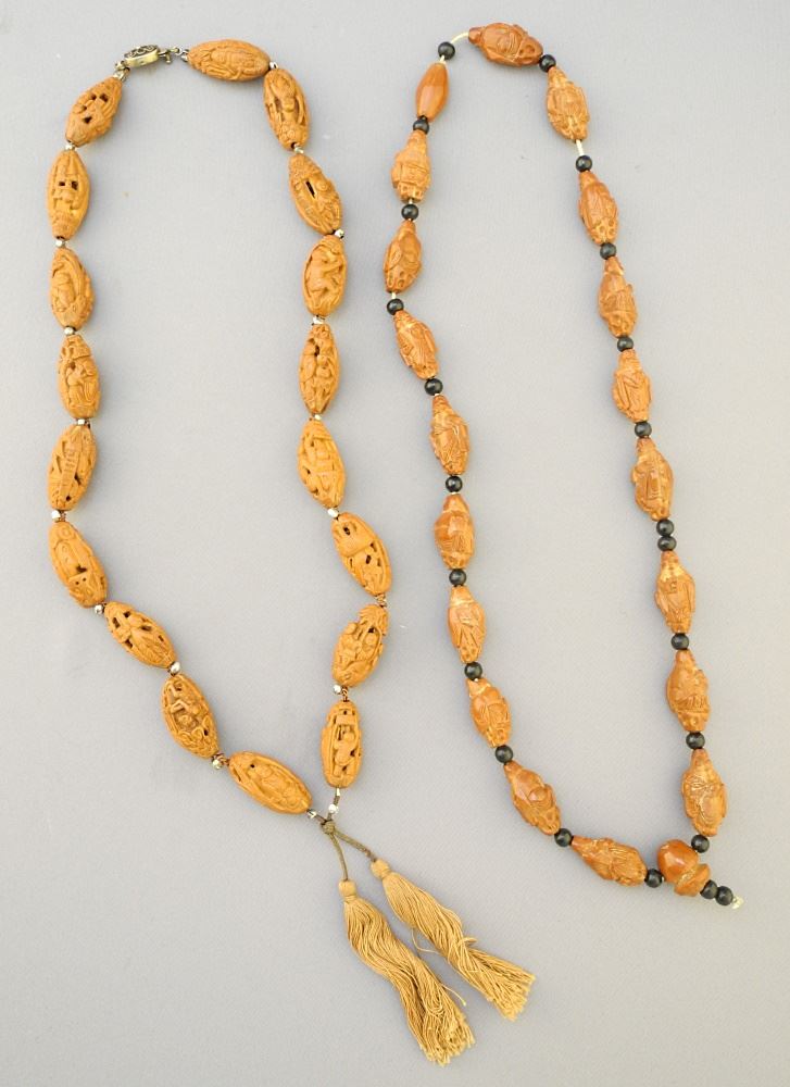 Two Chinese Carved Coquilla Nut Beaded Prayer Necklaces, 21" & 22".