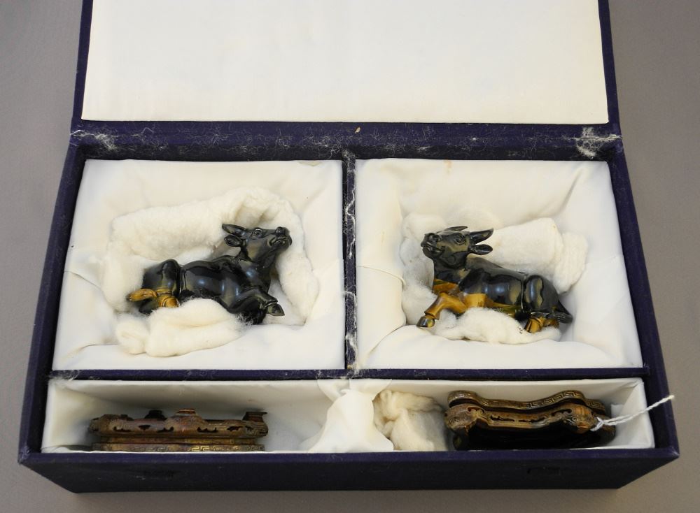 LOT 225 Pair of Chinese Tiger's Eye Oxen Carvings with Inlaid Stands & Case, 3 5/8" w. Estimate: $80 - $120 Sold For: $90 Auction Date: Tuesday, July 25 2023 at 4:00 PM