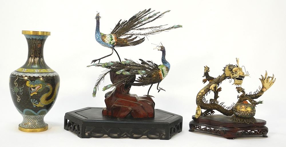 LOT 187 Chinese Cloisonne Vase (9"H) and enameled Filigree Peacocks and Dragon with a stand (13 3/ Estimate: $80 - $100 Sold For: $170 Auction Date: Tuesday, July 25 2023 at 4:00 PM