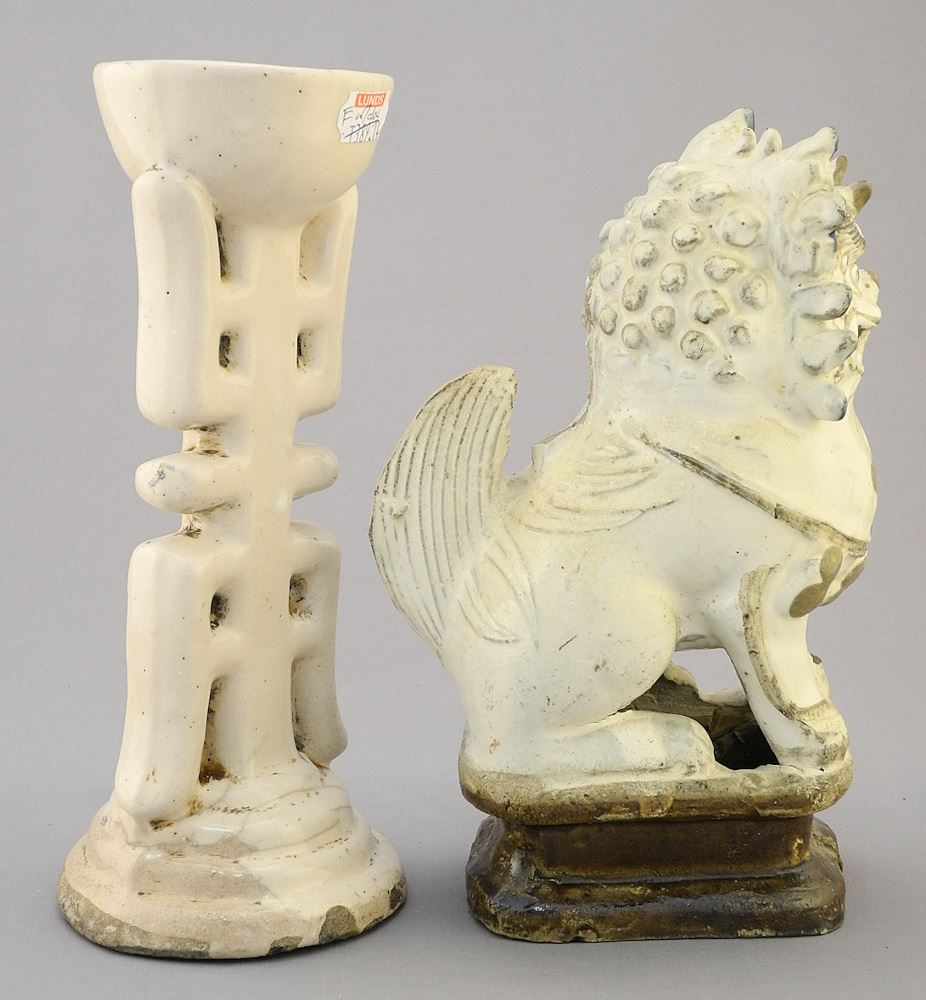 LOT 228 Chinese Porcelain Buddhist Lion Dog, (7 1/2"H) and Candlestick. Estimate: $50 - $100 Auction Date: Tuesday, July 25 2023 at 4:00 PM