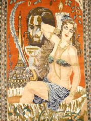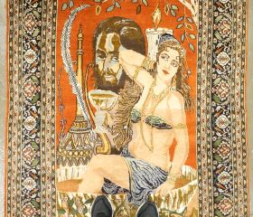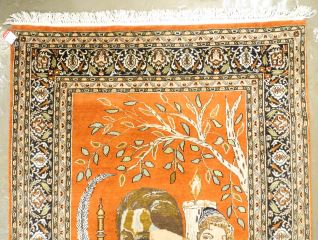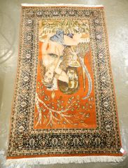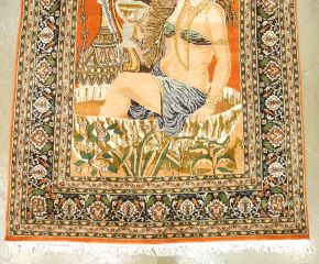 Indo Persian Omar Khayyam Subject Hand Knotted Wool & Cotton Blend Carpet, approx 7'2" x 4'.