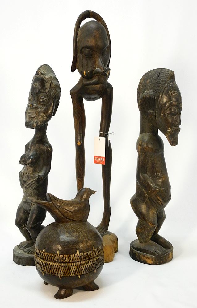 LOT 120 4 African Carvings: 3 Figures (20-25 "H) and Box, 8 1/2"H. Estimate: $50 - $100 Sold For: $80 Auction Date: Tuesday, July 25 2023 at 4:00 PM
