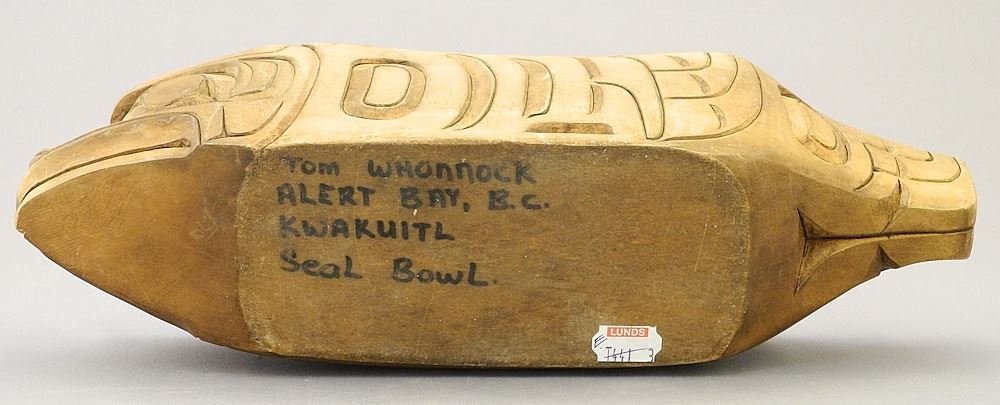 Kwagiulth Carving signed Tom Whonnock, 12"L, "Seal Bowl".
