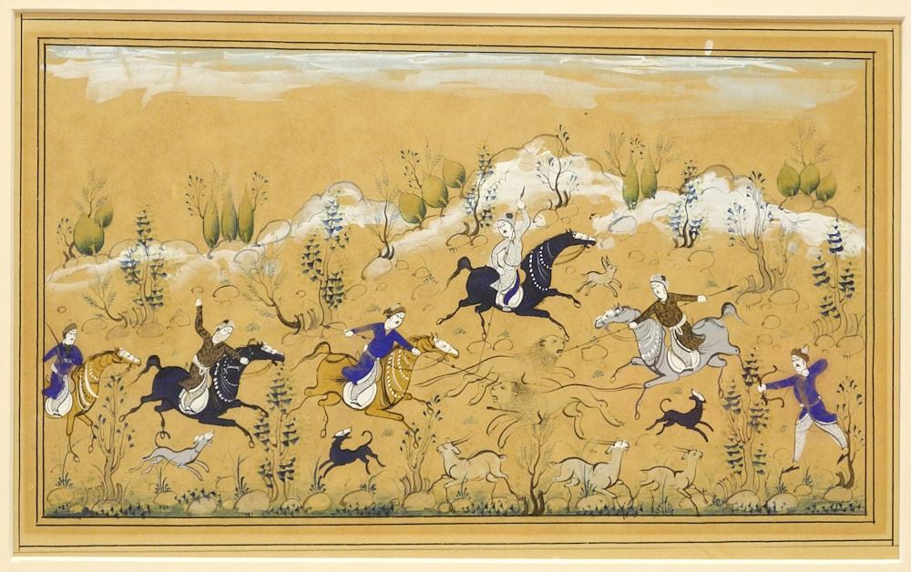 Pair of Mughal Ink and Opaque Water- colours: Hunt Scene and Encampment, 6" x 10".