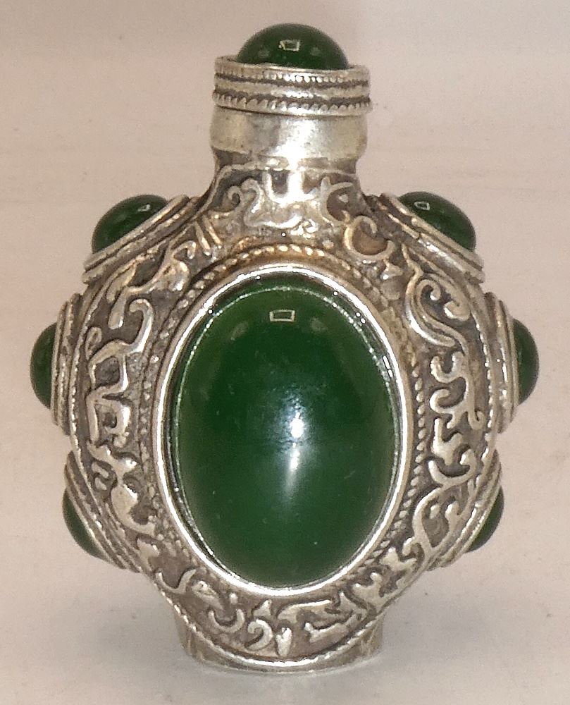 Spinach Jadeite Inlaid Snuff Bottle, 2 1/4"h & Foo Dog Lion Paper Weight, 3"h.