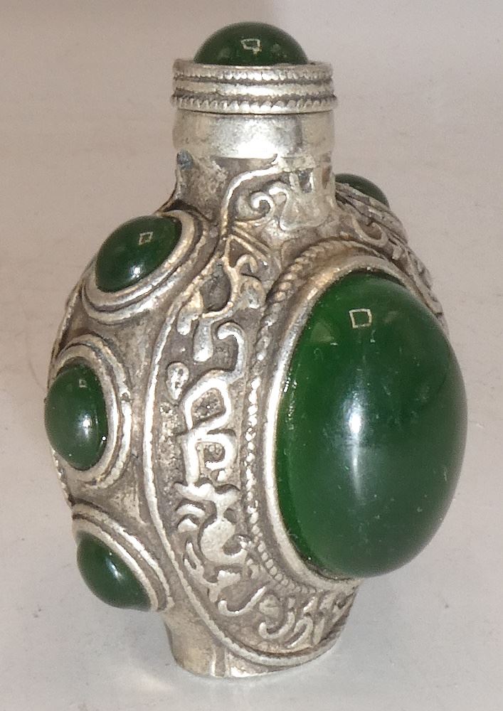 LOT 207 Spinach Jadeite Inlaid Snuff Bottle, 2 1/4"h & Foo Dog Lion Paper Weight, 3"h. Estimate: $60 - $80 Sold For: $20 Auction Date: Tuesday, July 16 2024 at 4:00 PM