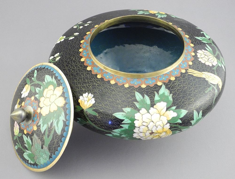 Chinese Black Ground Cloisonne Covered Vessel, 6 x 9" Diameter.