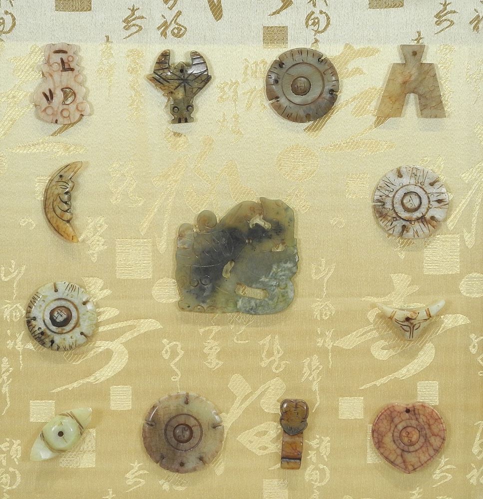 Collection of Chinese Carved Stone Amulets, Framed, 19 x 19".