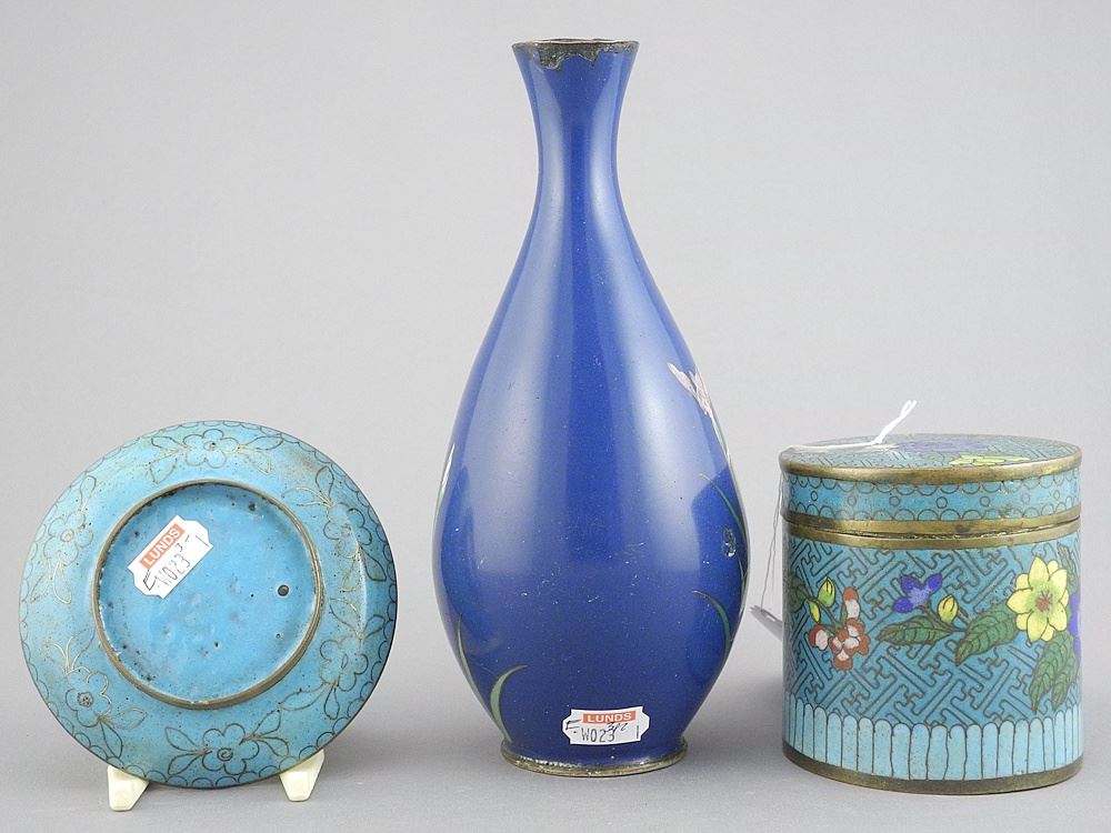 LOT 35 Three Cloisonne Items: Japanese Vase (7 1/4") / Chinese Cigarette Box & Ashtray. Estimate: $50 - $60 Sold For: $50 Auction Date: Tuesday, April 15 2025 at 4:00 PM