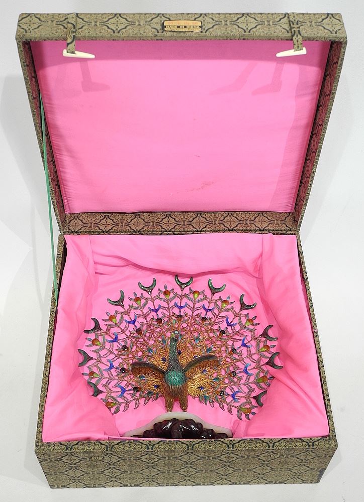 LOT 162 Chinese Cloisonne Filigree & Enamel Peacock, 2 Sections with Box, 11 3/4 ". Estimate: $300 - $350 Auction Date: Tuesday, April 15 2025 at 4:00 PM