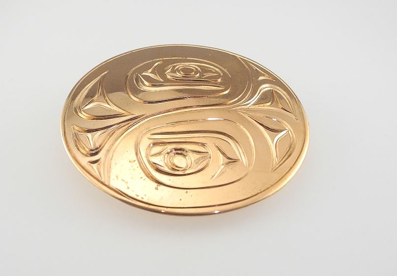 LOT 205 Kwagiulth Copper Pendant Monogrammed PS (Pat Seaweed), 2" Diameter, "Yin Yang Salmon". Estimate: $60 - $100 Sold For: $50 Auction Date: Tuesday, April 15 2025 at 4:00 PM