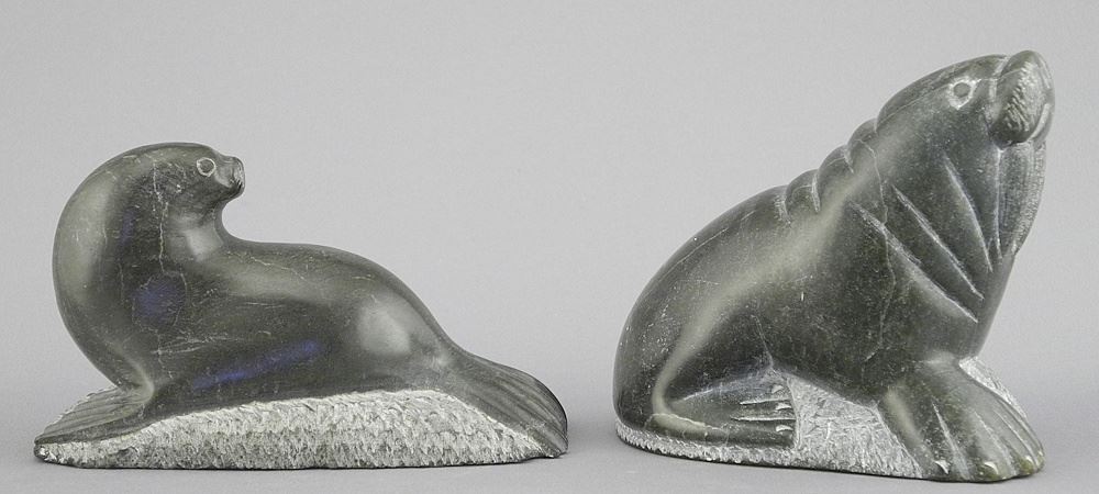 Two Inuit Stone Seal Sculptures signed with Syllabics, Dated 1980, 2 1/2" & 3"h.