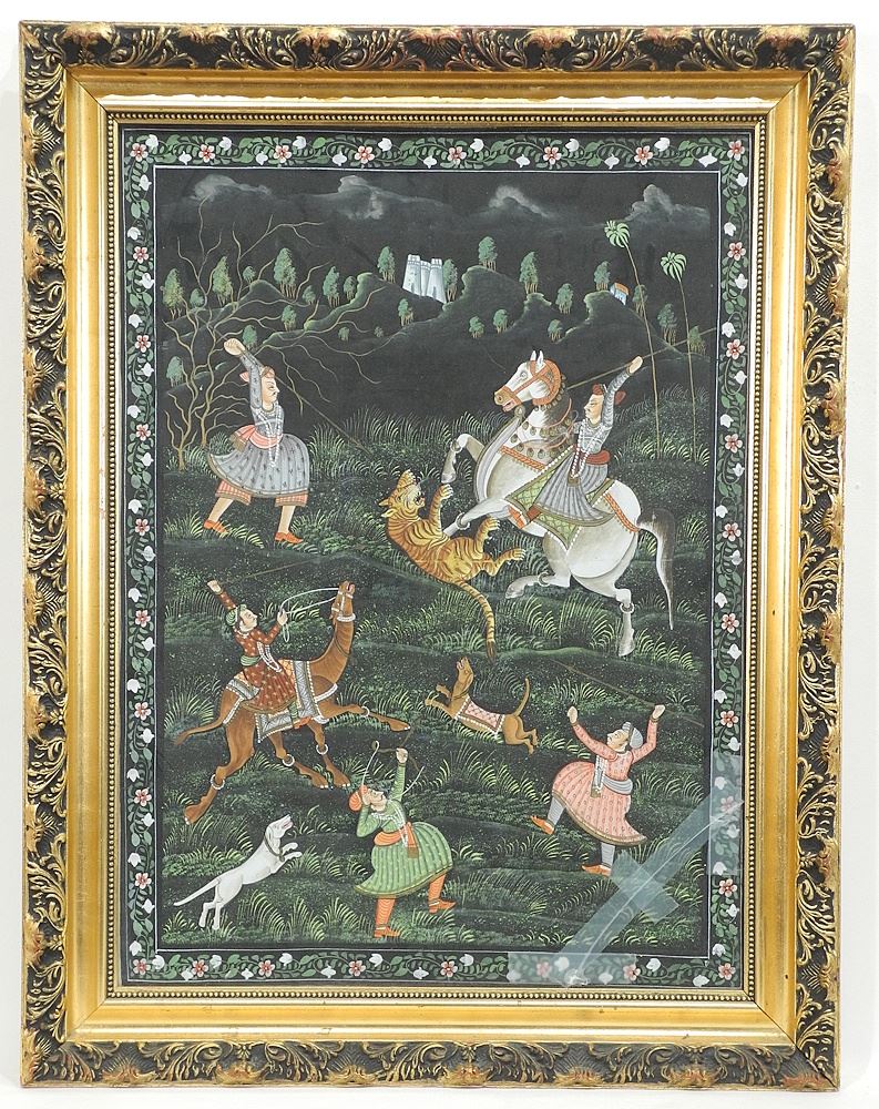 Persian Hunt Painting, 21 x 15 1/4" (glazing noted).