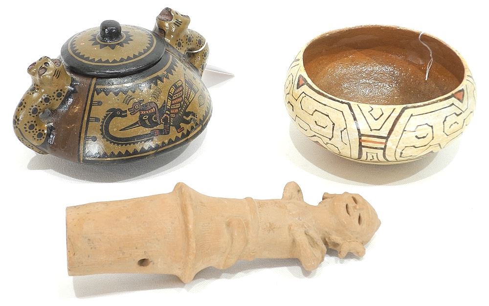 Three South American Pottery Items: Shipibo/Covered & Figural Textile.