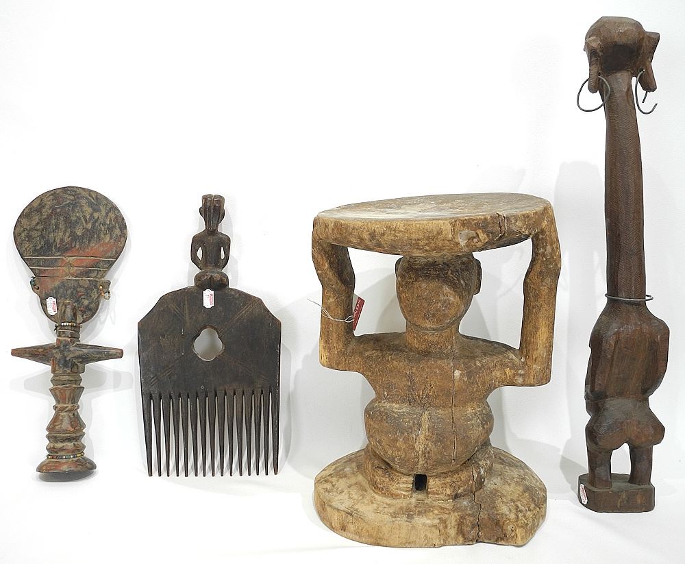 Four African Carvings: Stool/Comb/ Fertility/Long Necked, 13 - 20 1/4"h