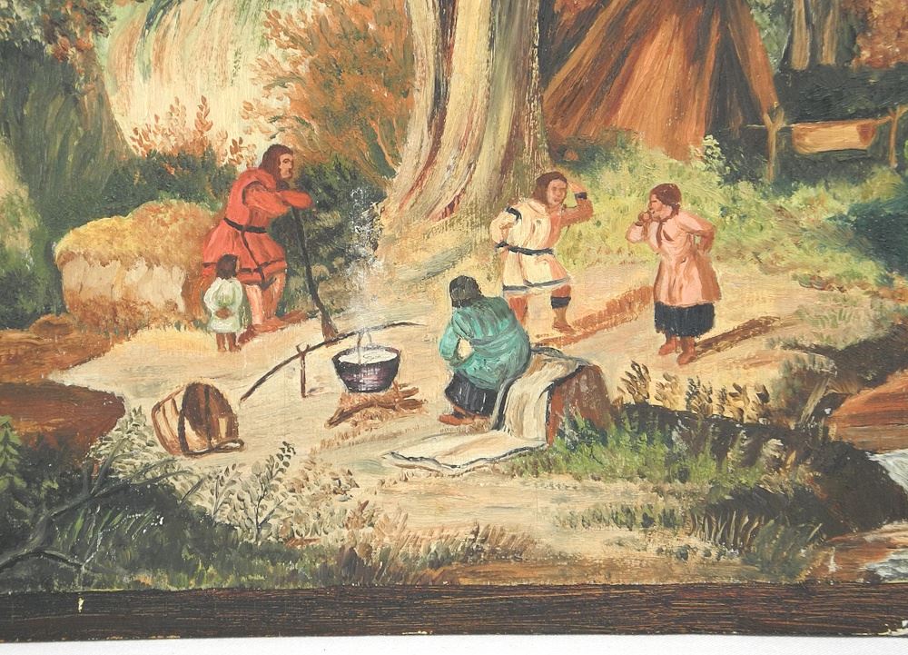 Unsigned Naive Oil on Board, 14 1/2 x 21 1/4", "Encampment with Tipi".