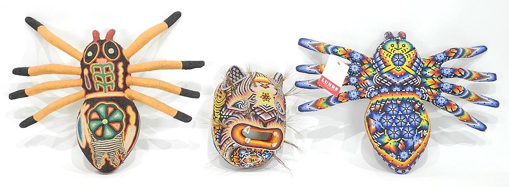 Four Huichol Beaded & Yarn Art Panel /Spider & Jaguar Figures, 13"w.