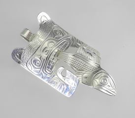 LOT 102 Kwagiulth Silver Pendant Monogrammed SS (Solomon Seward), 2 7/8", 18g, "Bear Eating Salmon". Estimate: $120 - $180 Sold For: $140 Auction Date: Tuesday, April 15 2025 at 4:00 PM