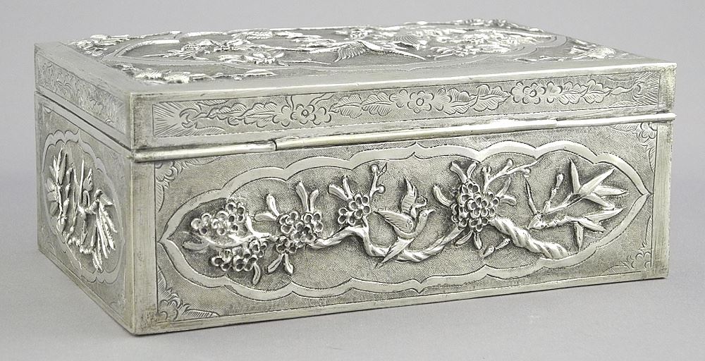 LOT 82 Chinese Export Silver Plated Box, 2 1/4 x 5 5/8 x 3 5/8". Estimate: $80 - $120 Sold For: $80 Auction Date: Tuesday, April 15 2025 at 4:00 PM