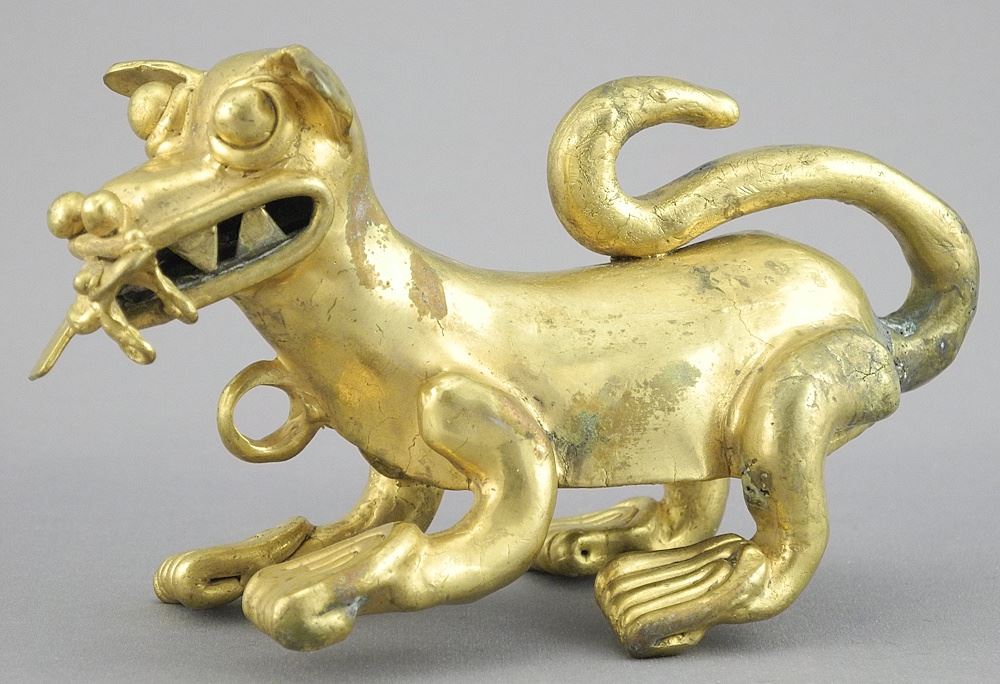 LOT 75 Pre-Columbian Style Gold Plated Dog Pendant, 5"L, 366g. Estimate: $100 - $200 Sold For: $200 Auction Date: Tuesday, April 15 2025 at 4:00 PM