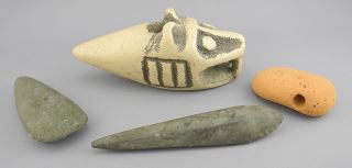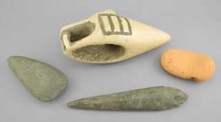 Two Latin American Pre-Columbian Stone Celts/Terracotta Pendant/ Ceramic Object, 3 1/4-7".