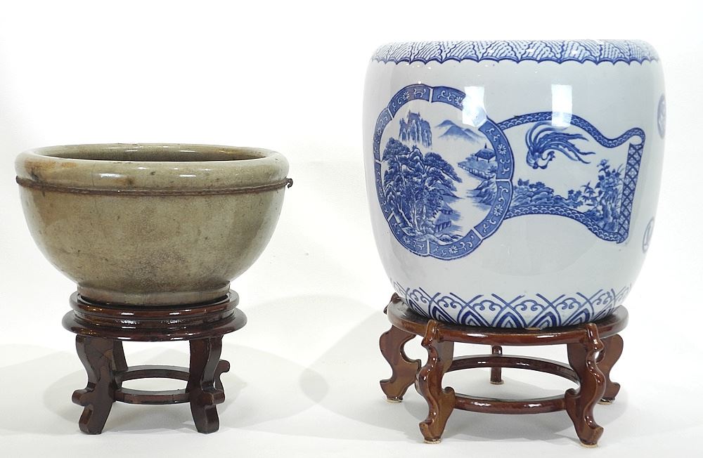 LOT 169 Japanese Blue & White Imari Porcelain Hibachi (8 3/4"h) & Katakuchi Bowl, 4 3/4"h. Estimate: $60 - $100 Auction Date: Tuesday, June 03 2025 at 4:00 PM