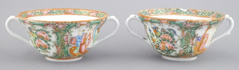 Collection of Chinese Rose Mandarin Porcelain Double Handled Cups & Saucers.