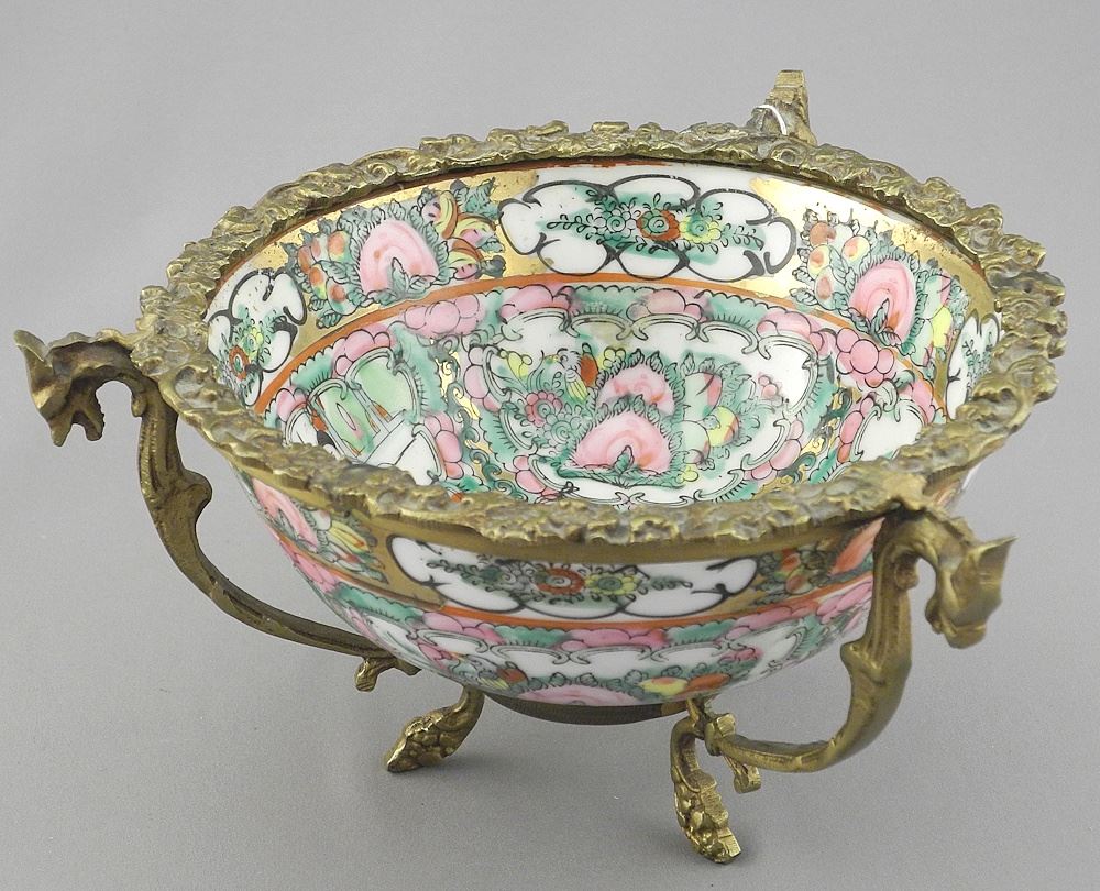 LOT 220 Two Canton Enamel Dishes: Gilt Metal Mounted (4 1/4 x 7 3/4" diam.) & Celadon 8 3/8"w. Estimate: $60 - $100 Sold For: $30 Auction Date: Tuesday, June 03 2025 at 4:00 PM