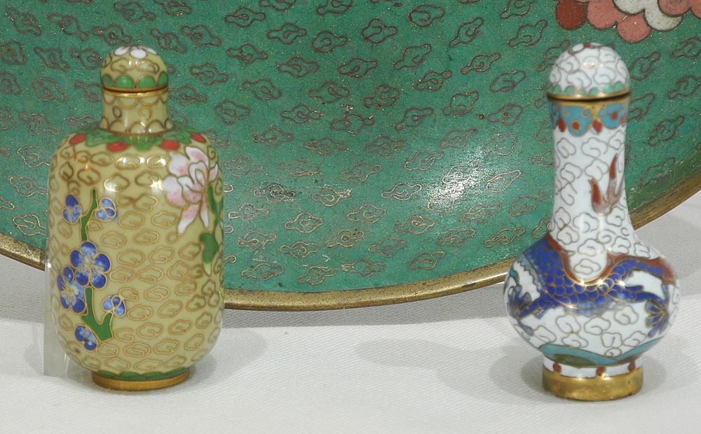 LOT 203 Three Cloisonne Items: Japanese Dish (11" diameter / edge bumped) & Two Chinese Snuff Bottles. Estimate: $60 - $100 Sold For: $225 Auction Date: Tuesday, June 03 2025 at 4:00 PM