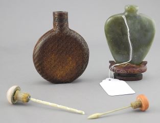 Two Chinese Snuff Bottles: Basket Weave Woven Fibre Style (3 3/8"h) & Serpentine, 3"h.