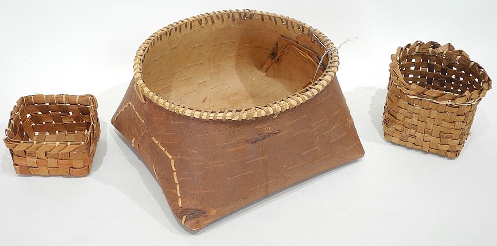 LOT 171 Three First Nations Baskets: Bark (9 3/4"w) & Two Cedar, 2 1/2 & 4"h. Estimate: $50 - $70 Sold For: $30 Auction Date: Tuesday, June 03 2025 at 4:00 PM