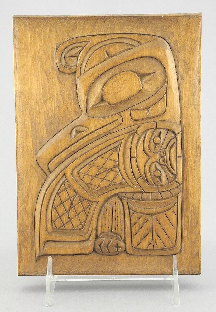 Tsimshian Panel Carving signed Ray Wesley, 7 5/8 x 5 1/2", "Thunderbird & Sun".