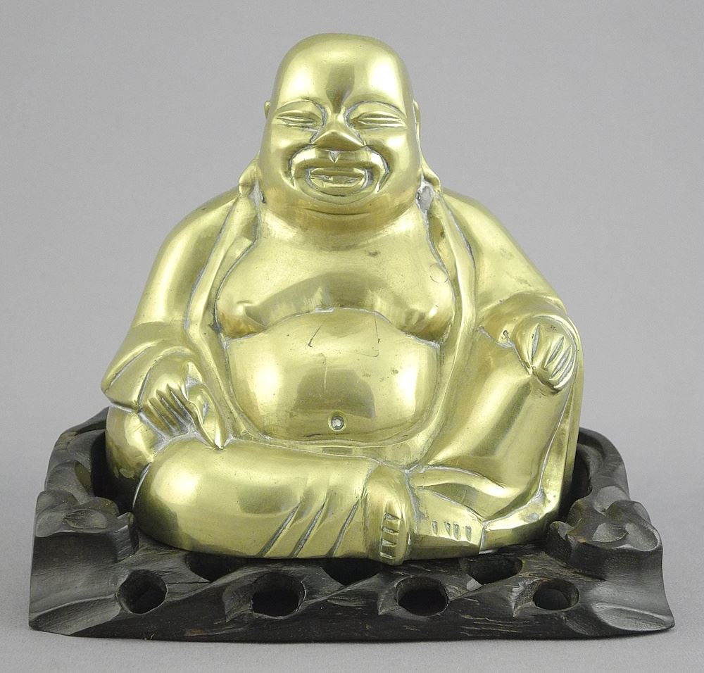Chinese Brass Buddha on Carved Wood Seat, TH 5", 567g.