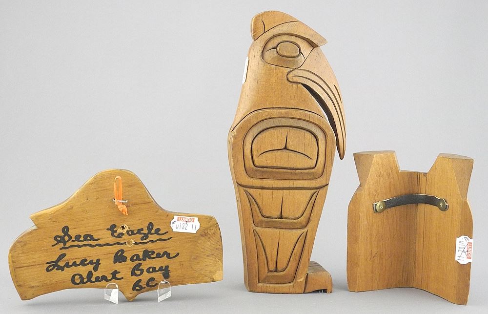 Three Northwest Coast Carvings: "Sea Eagle" signed Lucy Baker & Two Unsigned, 4-8 1/2"h.