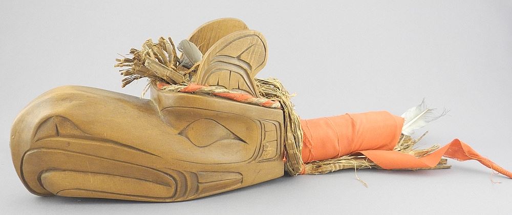Kwagiulth Rattle signed Sampson Robertson, 13"L, "Thunderbird", NO EXPORT.
