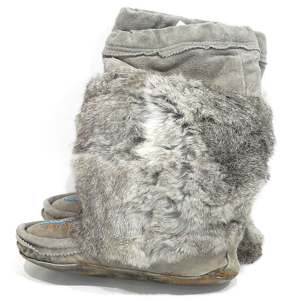 Pair of Beaded Fur Trimmed Mukluks, Grey, 11"L.